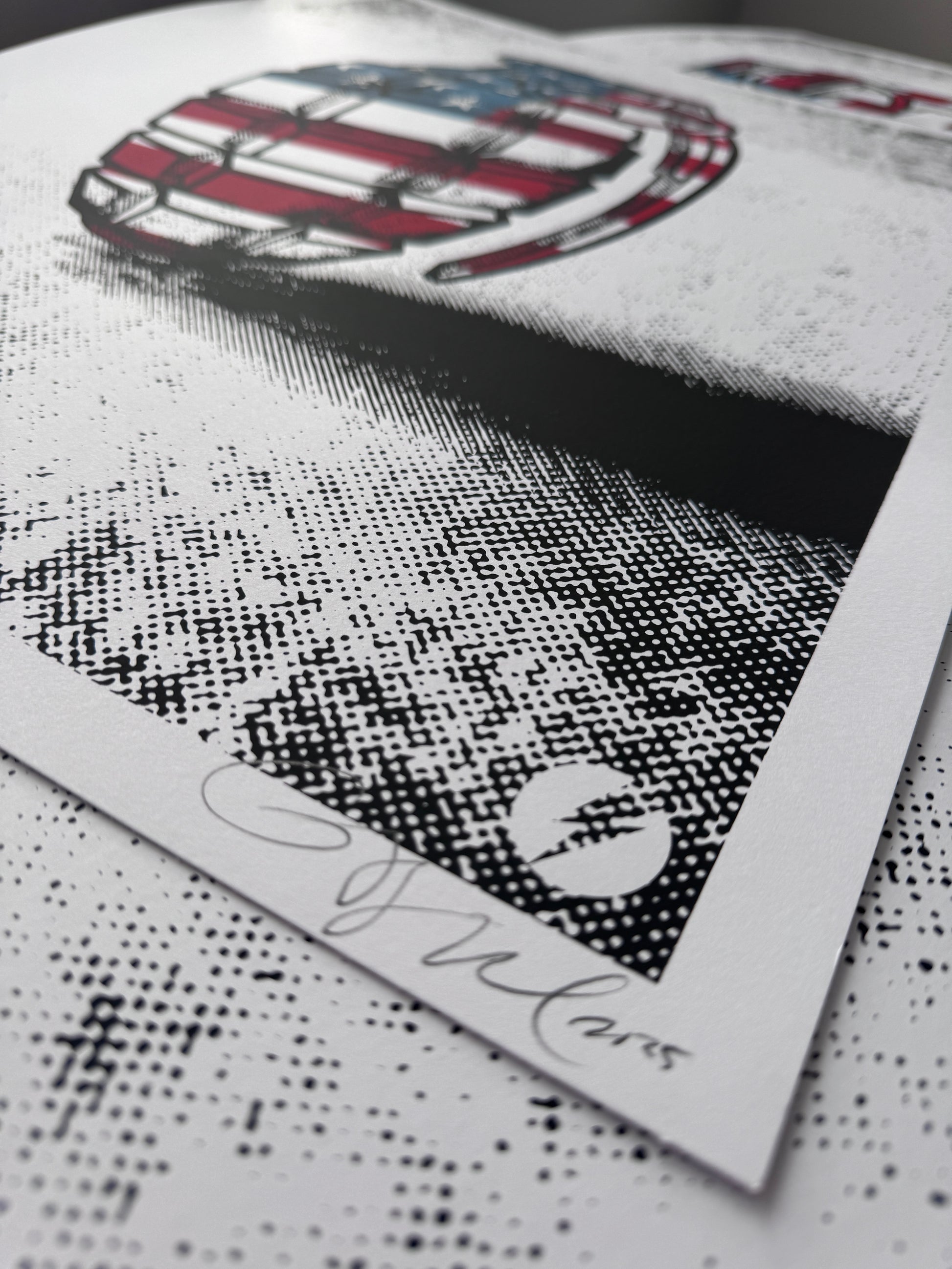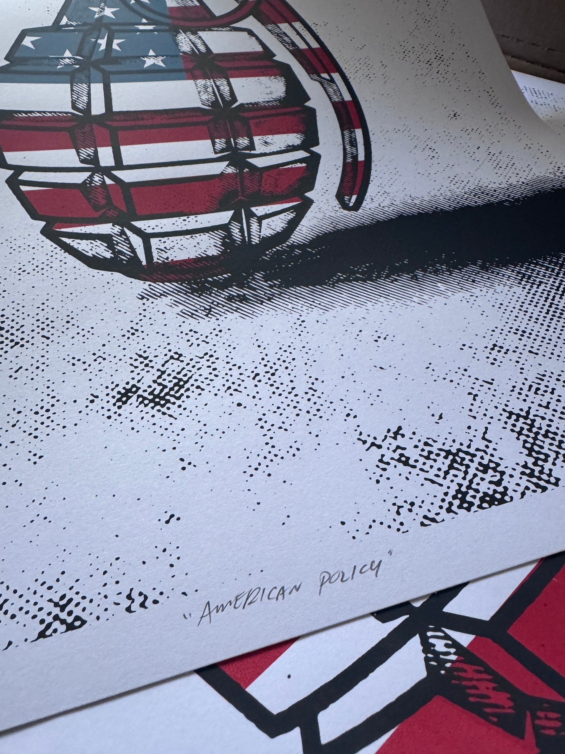 American Policy, as an American metaphor is meant to articulate our current situation and system. Originally called "Americans Will Brand Anything and Call It Freedom", this is the first major print I have created that isn't coming from something in the past design work. You'll see this make some appearances in some Dead Pioneers spots shortly, but for now, it's mine and it's in this print! These are 3 color screen print on archival paper but my good friends at Ink Lounge in Denver, CO.