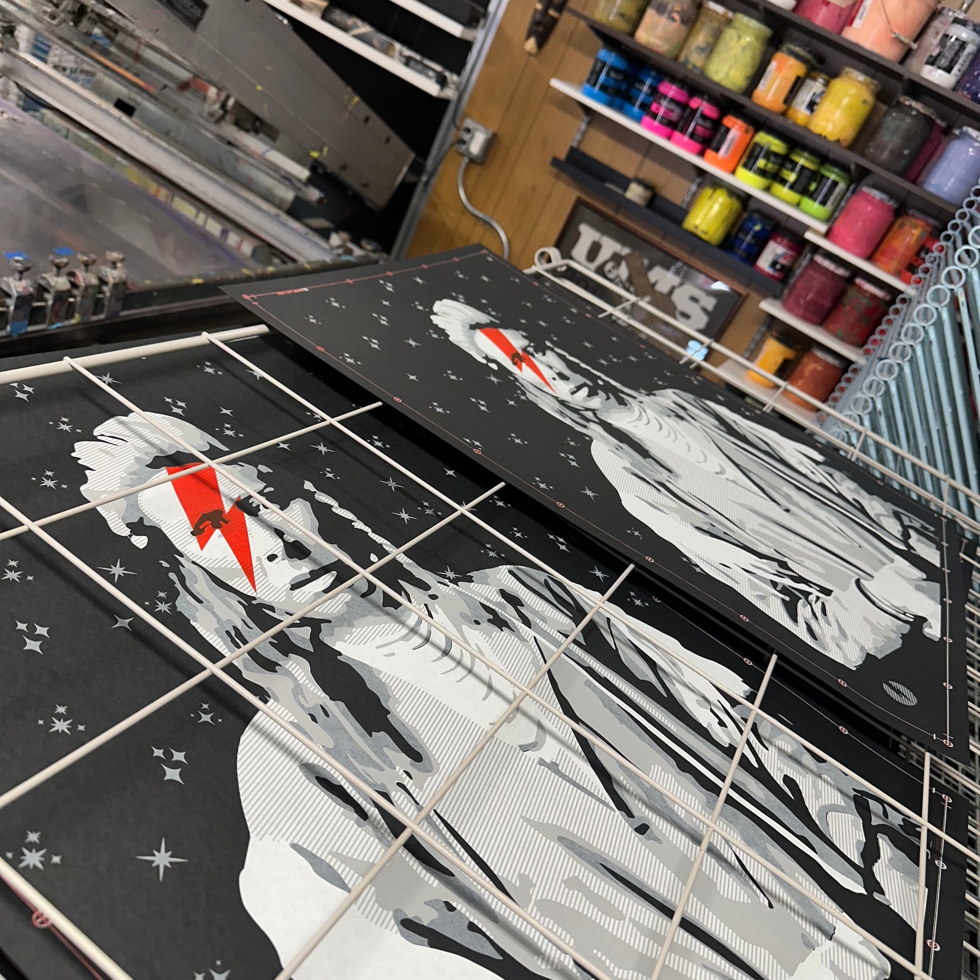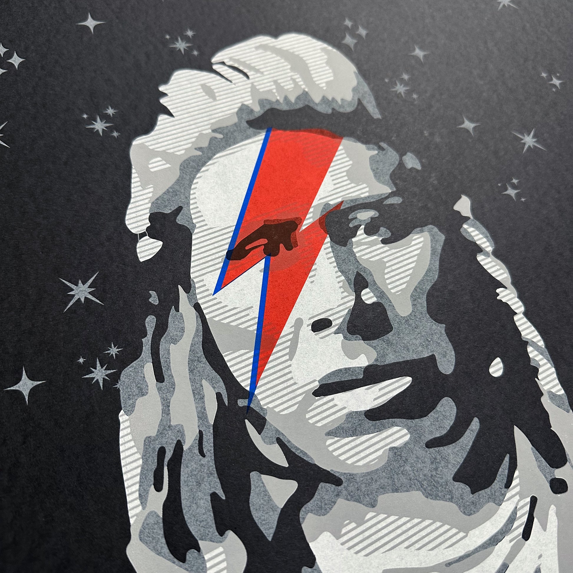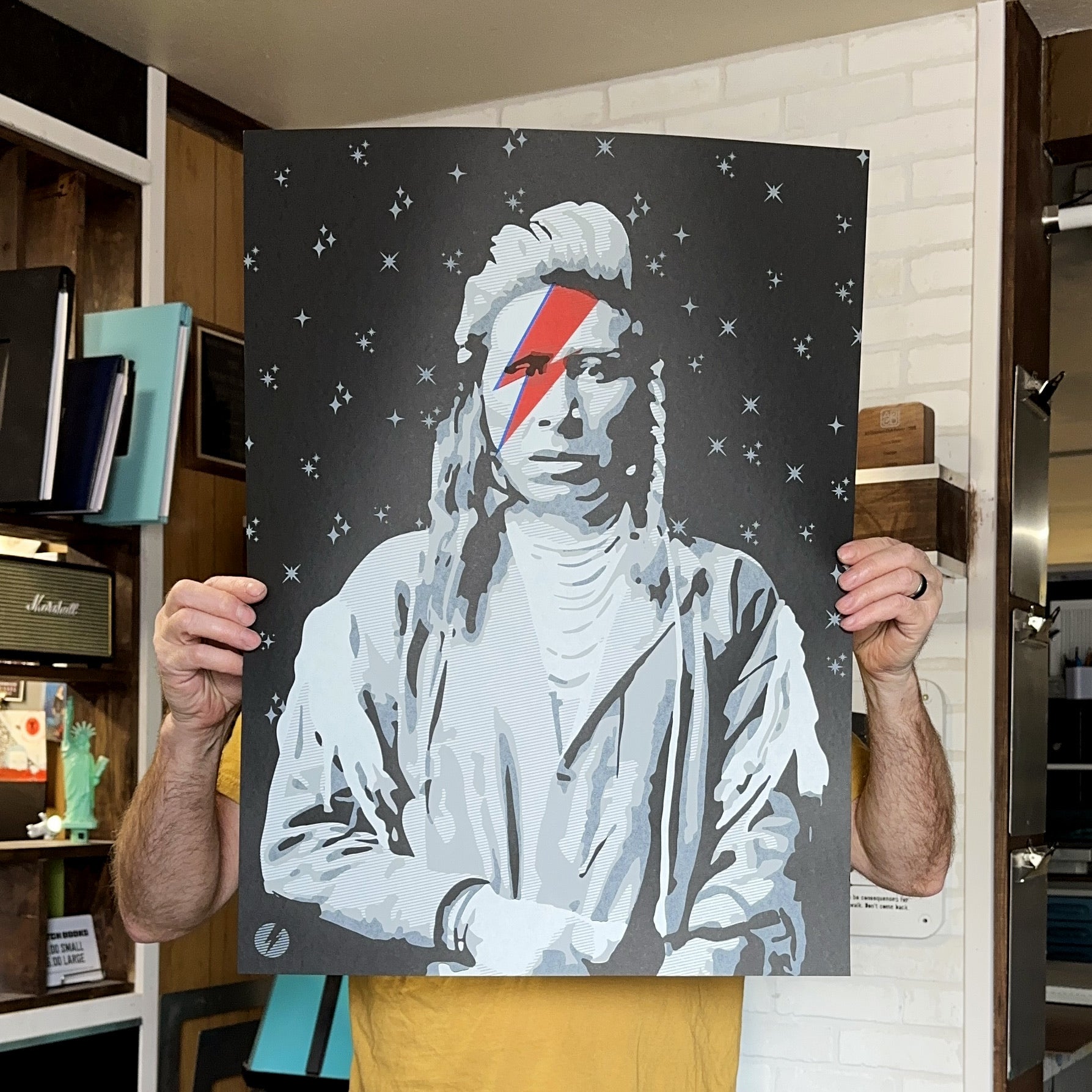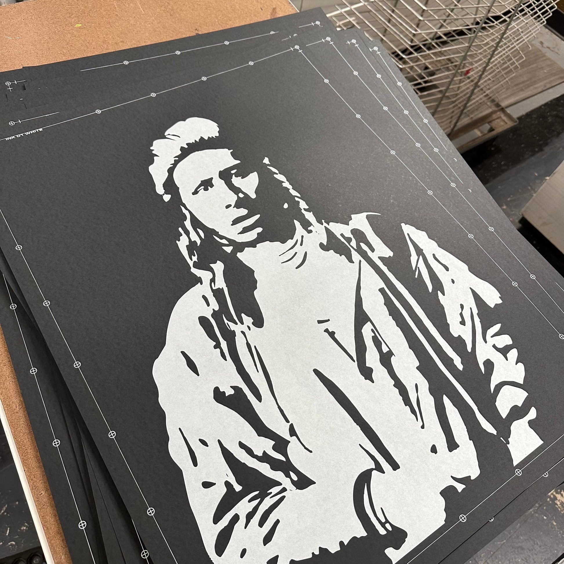 A mix of two different aspects of popular culture, the classic old image of an Indigenous persons, in case a Western Shoshone man named "Shoshone Pete", coupled with the lightening bolt referenced in David Bowie's iconic record cover for Aladdin Sane. A statement about Indigenous existence embodying all spaces, with a comment about the fact that while Native, we are also having an Indigenous experience. This original piece was first created by Gregg Deal in 2010, and has had life here and there since. There are a few iterations of the ZiggIndigenous print. Most have been done by hand, stencil and acrylic based spray paint in a larger size. There has been one very small run of screen printed versions, but the size was small as was the batch, all done by a small outfit for fun. This is pretty exclusive, as a result. Printed by my good friends at Ink Lounge in Denver, this is a nice entry point for first time buyers, and print collectors. This specific fun won't run again after this.